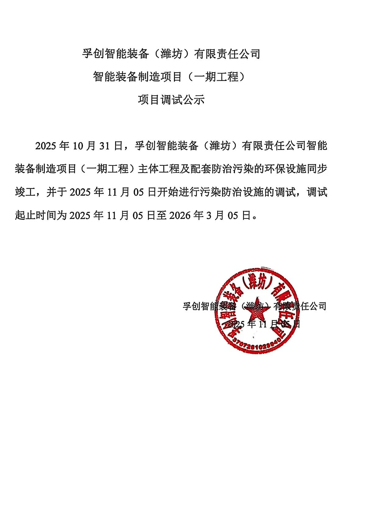 孚创智能装备(潍坊)有限责任公司智能装备制造项目(一期工程)调试公示