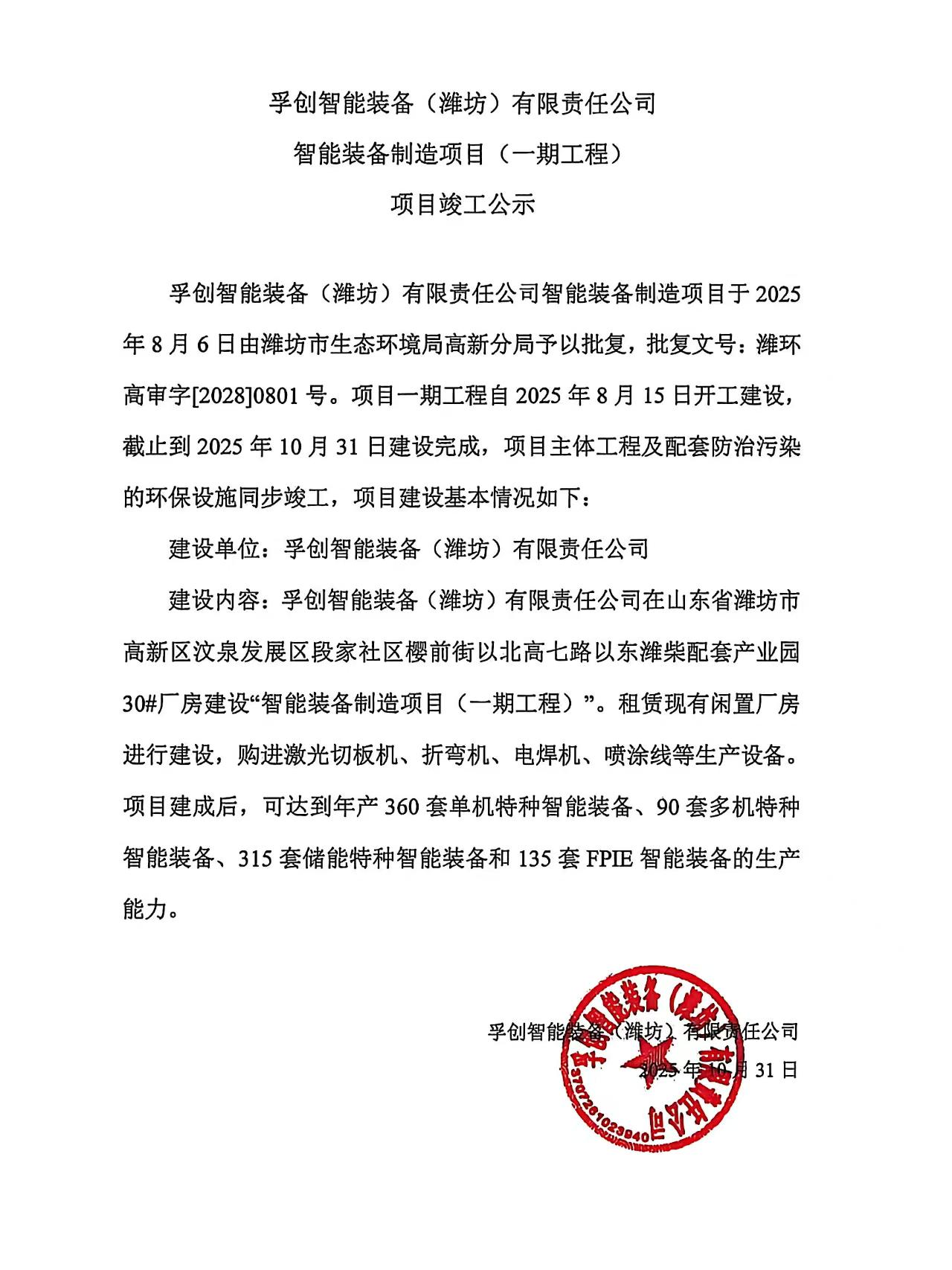 孚创智能装备(潍坊)有限责任公司智能装备制造项目(一期工程)竣工公示