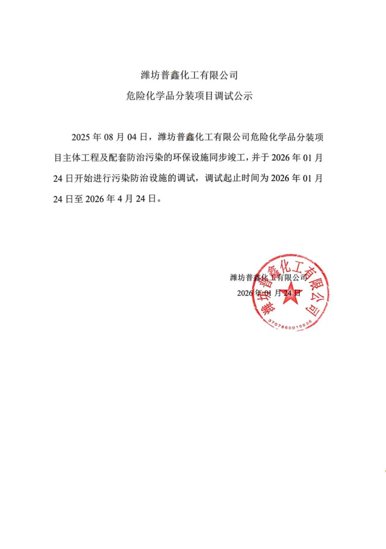 潍坊普鑫化工有限公司危险化学品分装项目调试公示